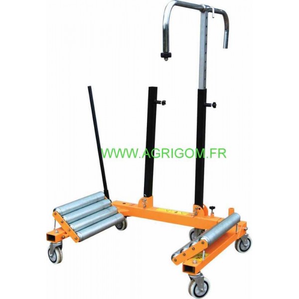 Chariot porteur/manipulateur de roues RENFORCE à 2x4 rouleaux RALLONGES conçu pour retirer/poser sans effort, rapidement et en sécurité les roues de véhicules agricoles ou industriels : tracteurs, pulvérisateurs, moisonneuses ...